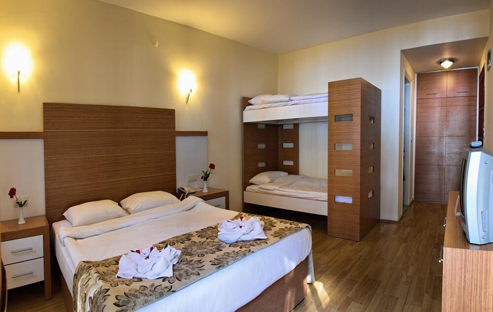 Club sobe nalaze se u bungalovima i veličine oko 22m (pored dva standardna ležaja mogu imati krevete na sprat), kupatilo (Tuš WC i fen za sušenje kose), klima uredjaj, mini-bar (uz doplatu), sef (uz doplatu), SAT TV uređaj, balkon ili terasa; superior sobe nalaze se u glavnoj zgradi veličine oko 25m², kupatilo (Tuš WC i fen za sušenje kose), klima uređaj, mini-bar (uz doplatu), sef (uz doplatu), SAT TV uređaj, balkon; club porodične sobe nalaze se u bungalovima i sastoje se od dve prostorije odvojene vratima veličine oko 35m², kupatilo (Tuš WC i fen za sušenje kose), klima uređaj, mini-bar (uz doplatu), sef (uz doplatu), SAT TV uređaj, balkon ili terasa.