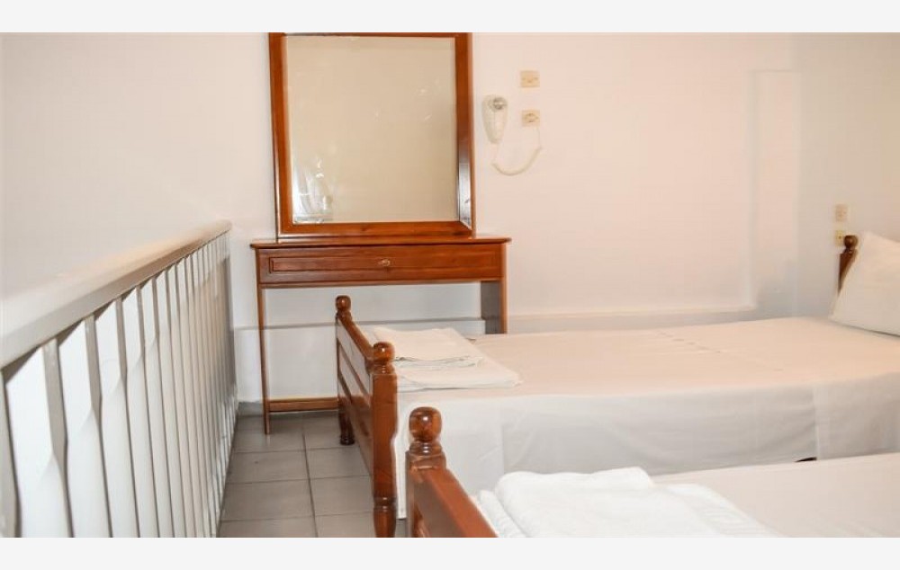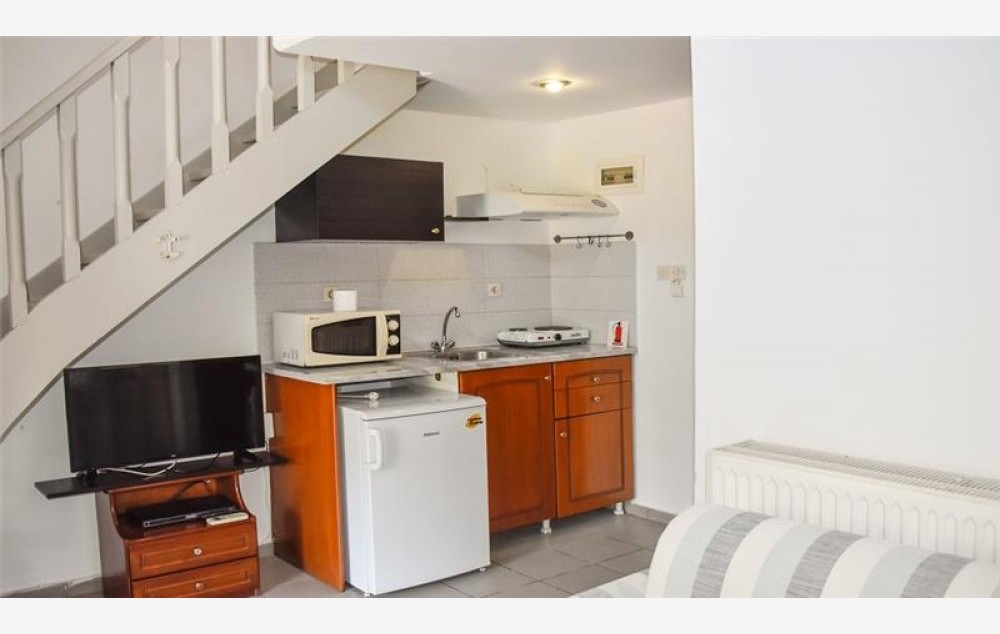 U studijima (tip mezonete – prizemlje u kome se nalazi sofa na razvlačenje, kuhinja i kupatilo i prvi sprat na kome se nalaze dva standardna ležaja). U studijima se mogu smestiti dve odrasle osobe ili dve odrasle osobe i dete ili tri odrasle osobe.U svakom studiju se nalazi TV,mikrotalasna rerna, ketler, mini frižider, rešo sa dve ringle, klima uređaj.Svi studiji imaju balkon. Pogled iz studija može biti ka bazenu i dvorištu ili prema ulici.