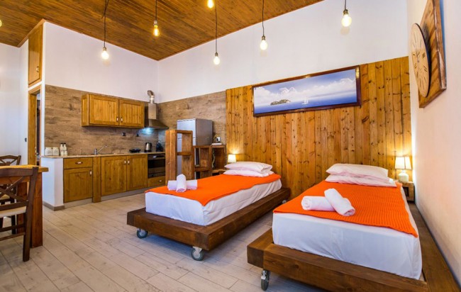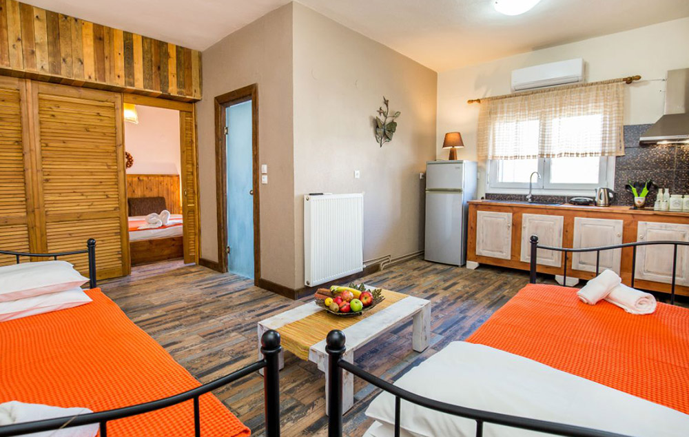 Opis: Poseduje dvokrevetna, trokrevetna I četvorokrevetna studija koja su smeštena na prvom spratu. Sve smeštajne jedinice poseduju čajnu kuhinju, kupatilo/wc, peškire, terasu, WiFi internet, TV, klima uređaj (uz doplatu na licu mesta od 5e dnevno). Gosti vile Panos mogu koristiti bazen vile Mary 1, koja je udaljena 200m.